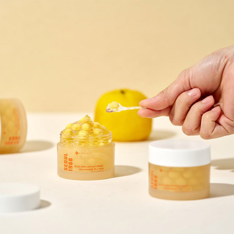 This SEOUL 1988 Capsule Cream : Niacinamide 5% + Yuja yet fast-absorbing capsule cream features 5 % niacinamide and fermented yuja (Citrus Junos) fruit oil to brighten dull skin and even complexion tone. The formula also includes sea buckthorn water, collagen water, and multiple forms of hyaluronic acid for deep hydration and barrier support.