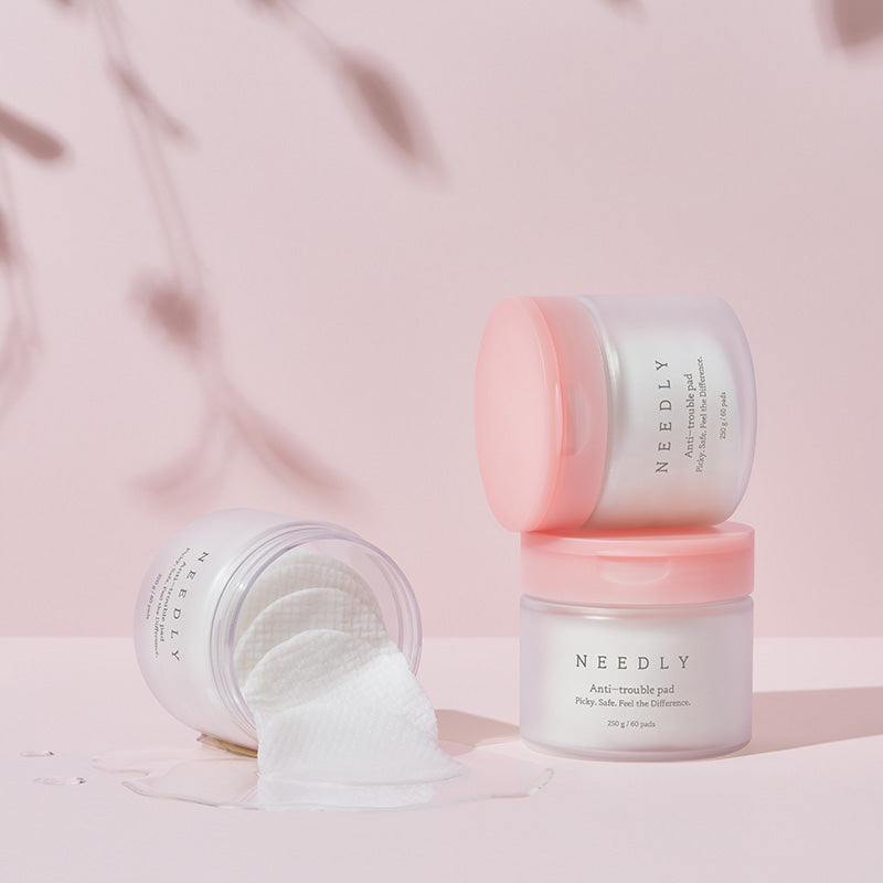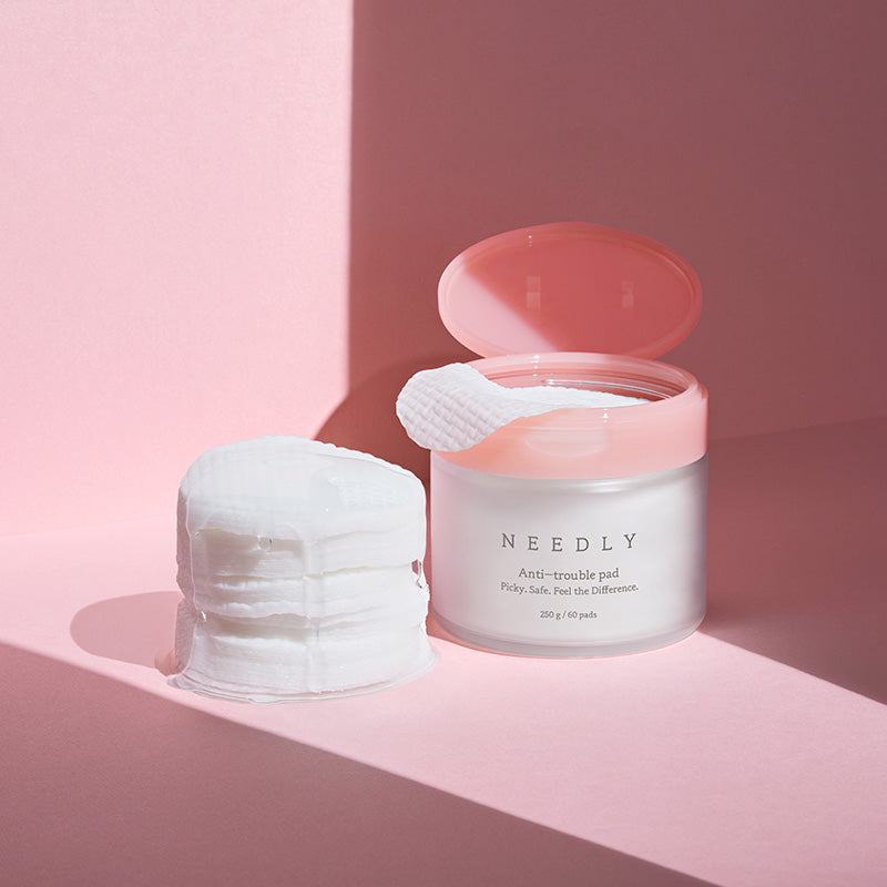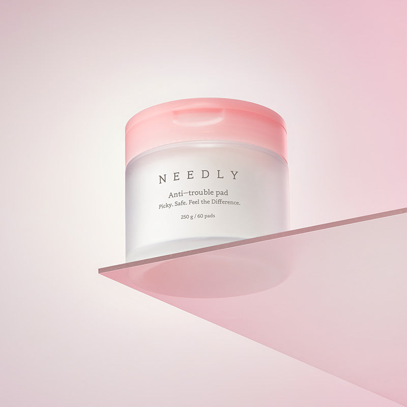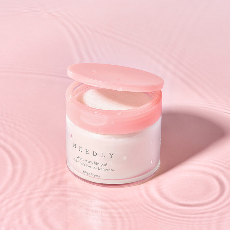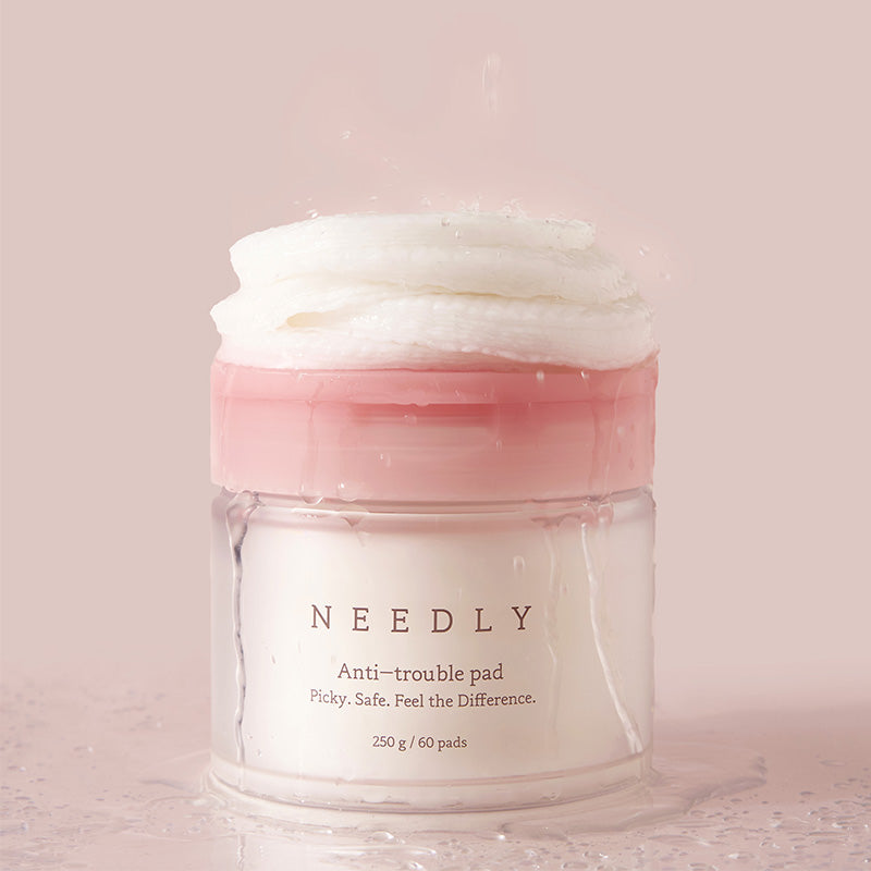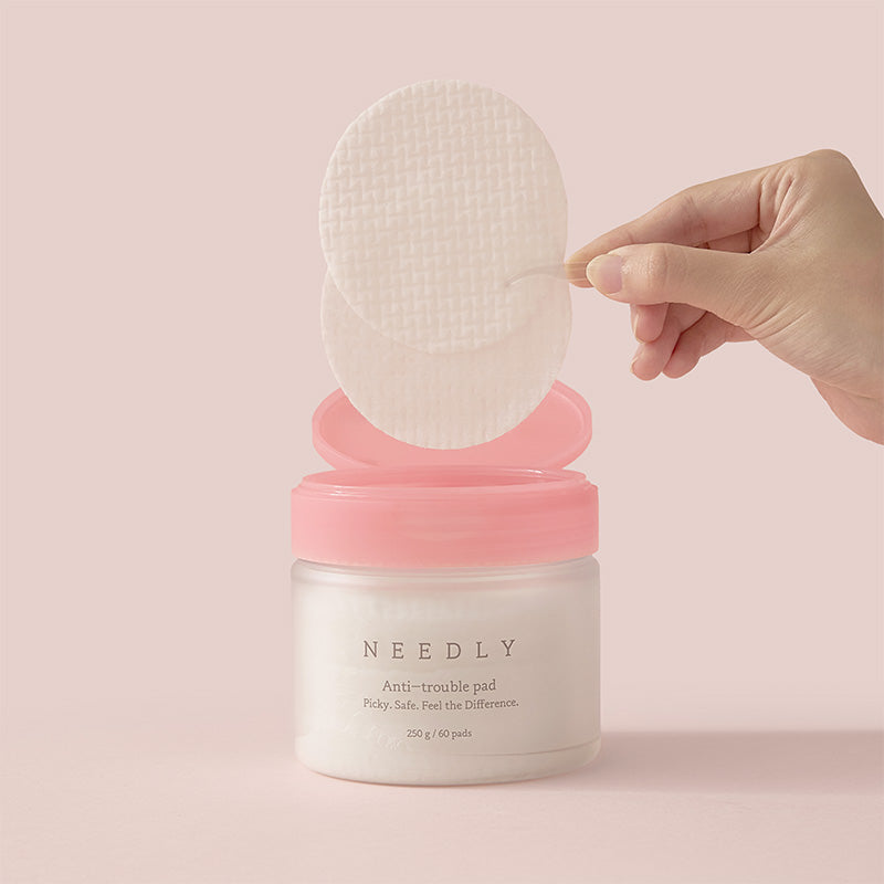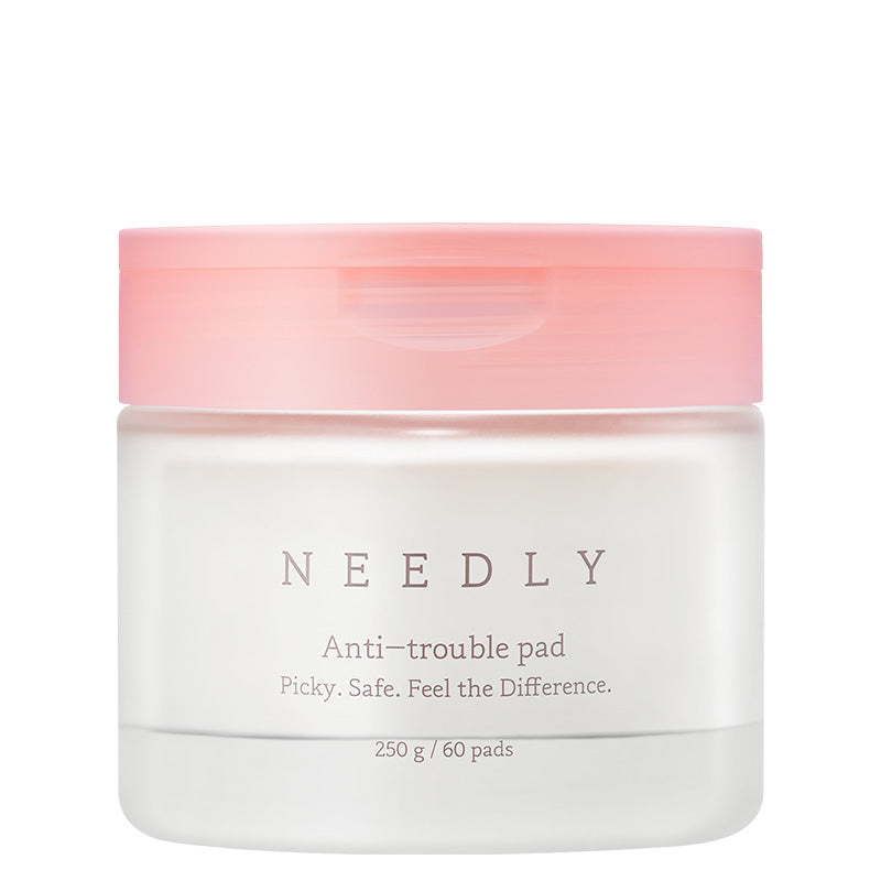 NEEDLY Anti-Trouble Pad is a multi-functional toner pad designed to clarify, soothe, and support skin recovery. It combines a gentle mix of exfoliants (AHA, BHA, PHA, and LHA) to remove dead skin cells and unclog pores while botanical actives like centella asiatica, panthenol, and herbal extracts calm redness and reinforce the barrier. The two-sided pad design includes an embossed grid side to lift away impurities and a smoother side to press in nourishing essence.