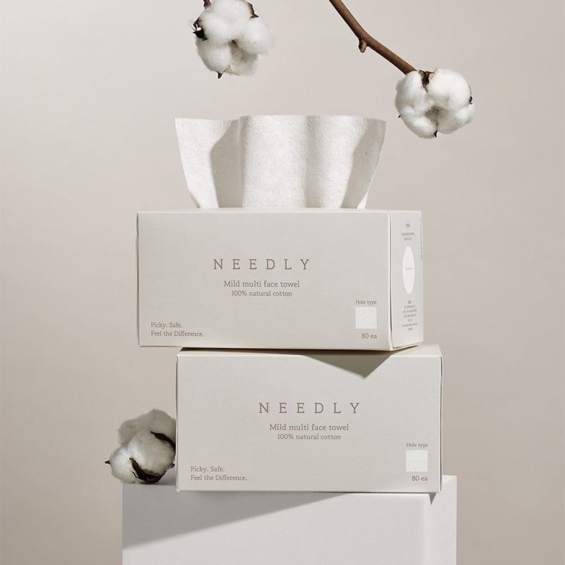 NEEDLY Mild Multi Face Towel is a single-use facial cloth made from 100 % natural, Oeko-Tex certified cotton to ensure a soft, irritation-free touch. It functions as a hybrid between a towel, cotton pad, and tissue, designed to absorb excess moisture, wipe away cleansers or masks, and offer hygiene without the risk of bacteria buildup.