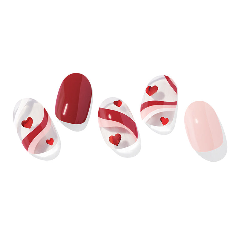 Inspiriert von einer Pralinenschachtel, zeigt diese süße und weiche Maniküre eine rote und rosa Basis mit einem herzförmigen Akzent.