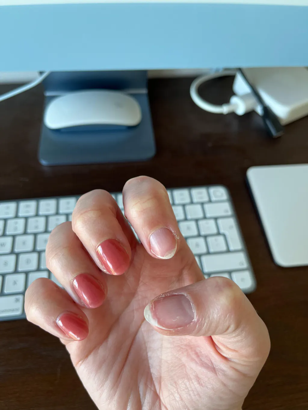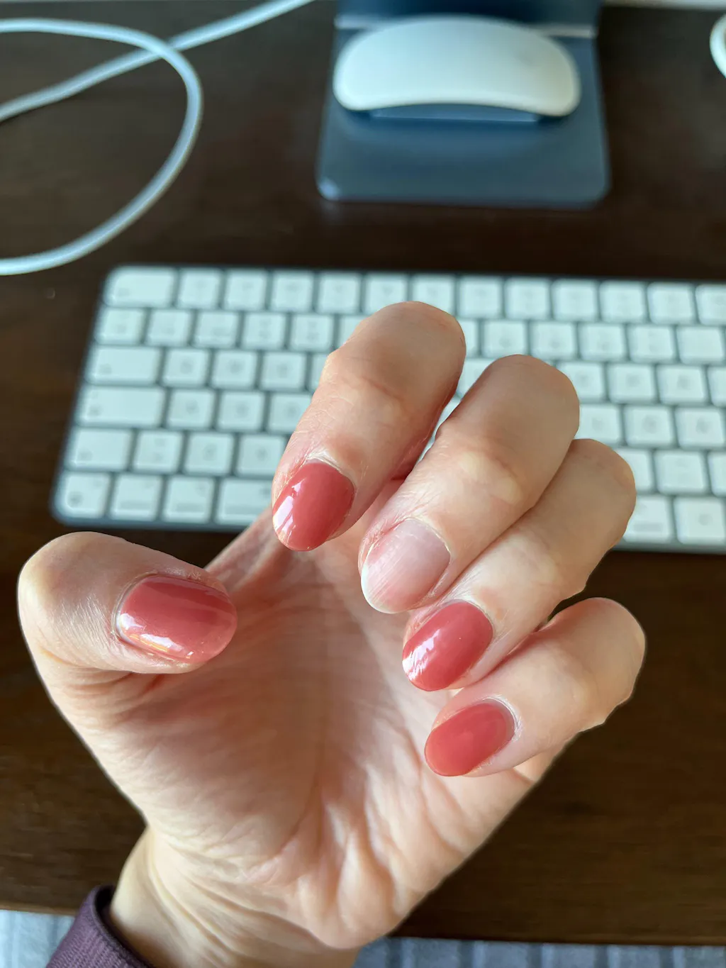 For the context; I have been using Ohora nails for over a year. I have noticed that some would last up to two weeks, and some would just fall off the next day. The prep is the same for all the fingers. This one has been one of unreliable ones, especially when used with Ohora protection base coat. Some of them lasted 1 day, and some up to a week. They also have sticky surface which makes them even more difficult to work with. Attached picture are my current hands, 24 hours after I did my nails.
